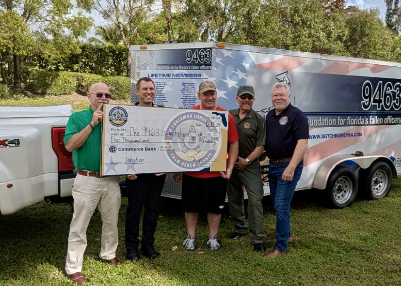 | Members of the Executive Board of FOP Lodge 50 and the Five-0 Foundation were on hand to present a $5,000 check to Brian Donnelly, co-founder of the 9463 Foundation for Florida's Fallen Officers, in support of the great work they do for the families of fallen officers within the State of Florida. Named in honor of Broward County Sheriff Sergeant Chris Reyka, badge number 9463, their mission is to: remember fallen heroes, educate the public, and support and assist the families who have lost loved ones while they were serving our community. One example of their extraordinary work is hand-delivering Christmas gifts to each family of a Fallen Officer who lives in Florida, regardless of where the Fallen Officer was working at the time of his/her passing. We take pride in knowing our small contribution will make a difference and bring joy and comfort to those families. To learn more about upcoming events, and how you may donate, click on 9463 FOUNDATION for FLORIDA'S FALLEN OFFICERS |